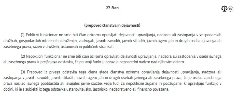 27. člen Zakona o integriteti in preprečevanju korupcije. (Foto: Posnetek zaslona-Pisrs.si)