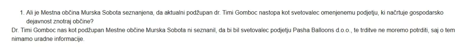 Občina Murska Sobota je v uradnih odgovorih priznala, da dr. Gomboc ni obvestil občinskih organov o svoji svetovalni vlogi in da nima vloge pri odločanju o podelitvi subvencij podjetju Pasha Balloons.