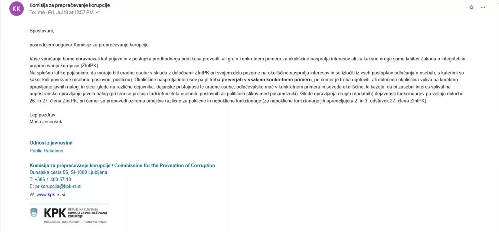 Komisija za preprečevanje korupcije je v svojem odgovoru potrdila, da bo primer preučila. KPK je namreč edini pristojni organ, ki lahko oceni, ali obstaja konflikt interesov v skladu z ZIntPK in ali so bile kršene določbe, ki urejajo prepovedi poslovanja in delovanja funkcionarjev v gospodarskih družbah. Kršitve teh določb lahko vodijo tudi do sankcij, vključno z odpoklicem funkcionarja in vračilom neupravičeno pridobljenih sredstev.