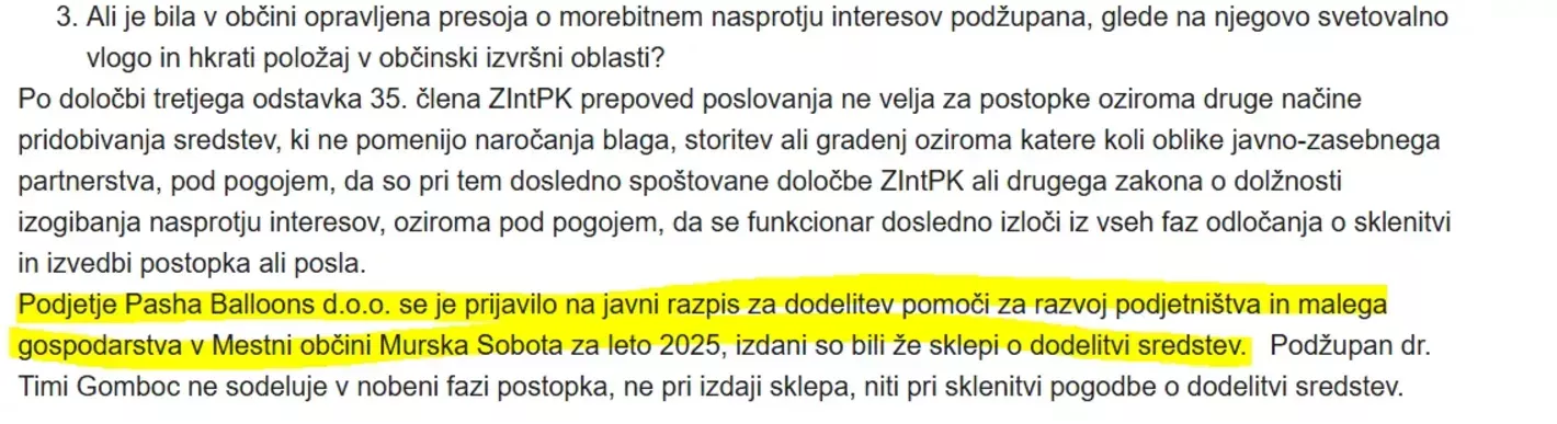 Po določbi tretjega odstavka 35. člena ZIntPK prepoved poslovanja ne velja za postopke oziroma druge načine pridobivanja sredstev, ki ne pomenijo naročanja blaga, storitev ali gradenj oziroma katere koli oblike javno-zasebnega partnerstva, pod pogojem, da so pri tem dosledno spoštovane določbe ZIntPK ali drugega zakona o dolžnosti izogibanja nasprotju interesov, oziroma pod pogojem, da se funkcionar dosledno izloči iz vseh faz odločanja o sklenitvi in izvedbi postopka ali posla. Podjetje Pasha Balloons d.o.o. se je prijavilo na javni razpis za dodelitev pomoči za razvoj podjetništva in malega gospodarstva v Mestni občini Murska Sobota za leto 2025, izdani so bili že sklepi o dodelitvi sredstev. Podžupan dr. Timi Gomboc ne sodeluje v nobeni fazi postopka, ne pri izdaji sklepa, niti pri sklenitvi pogodbe o dodelitvi sredstev.