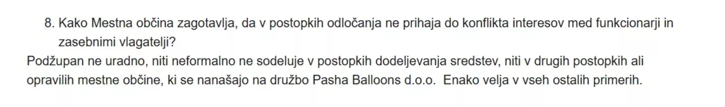 Podžupan ne uradno, niti neformalno ne sodeluje v postopkih dodeljevanja sredstev, niti v drugih postopkih ali opravilih mestne občine, ki se nanašajo na družbo Pasha Balloons d.o.o. Enako velja v vseh ostalih primerih.