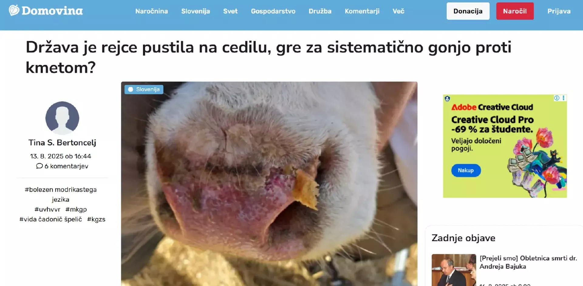 Toda težave slovenskega kmeta se ne končajo pri tem zakonu. Nedavno smo bili priča, kako je država rejce pri bolezni modrikastega jezika pustila povsem na cedilu. Brez cepiv, brez jasnih smernic in brez finančne pomoči so kmetje sami nosili stroške in tveganja. To je bil jasen signal: država vas ne bo zaščitila kar je razkril članek z naslovom Po poljih se širi bolezen, na udaru predvsem sladkorna pesa novinarke Domovine Tine Sare Bertoncelj.