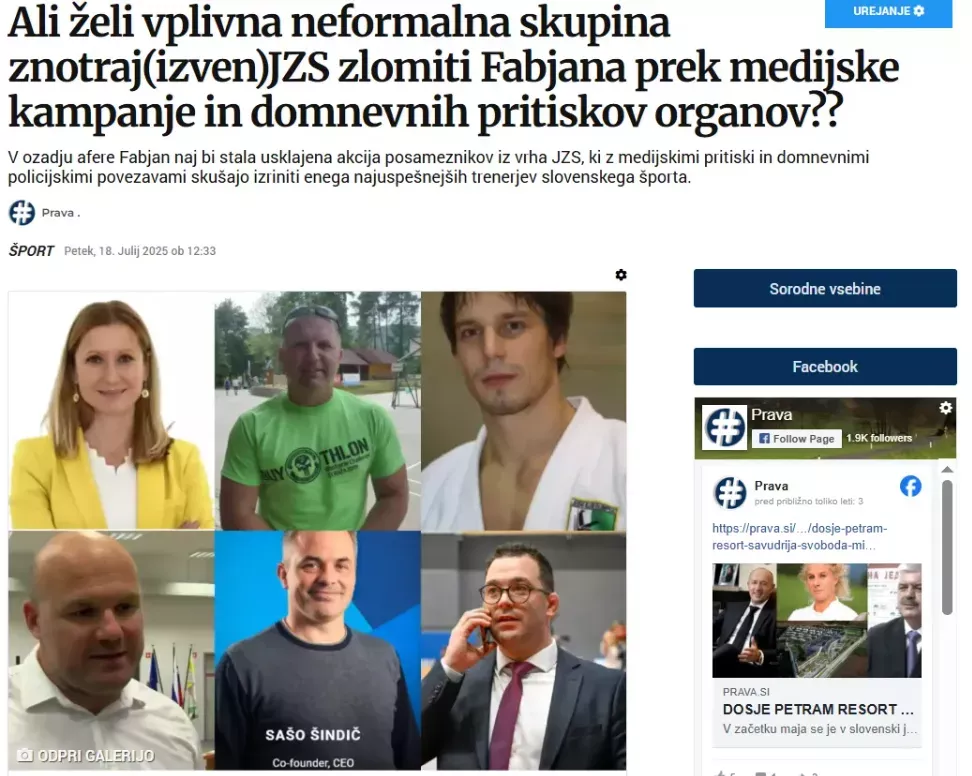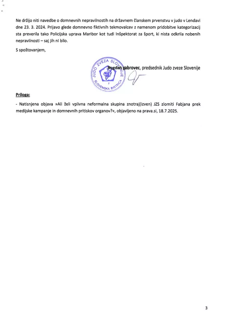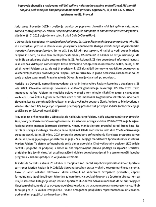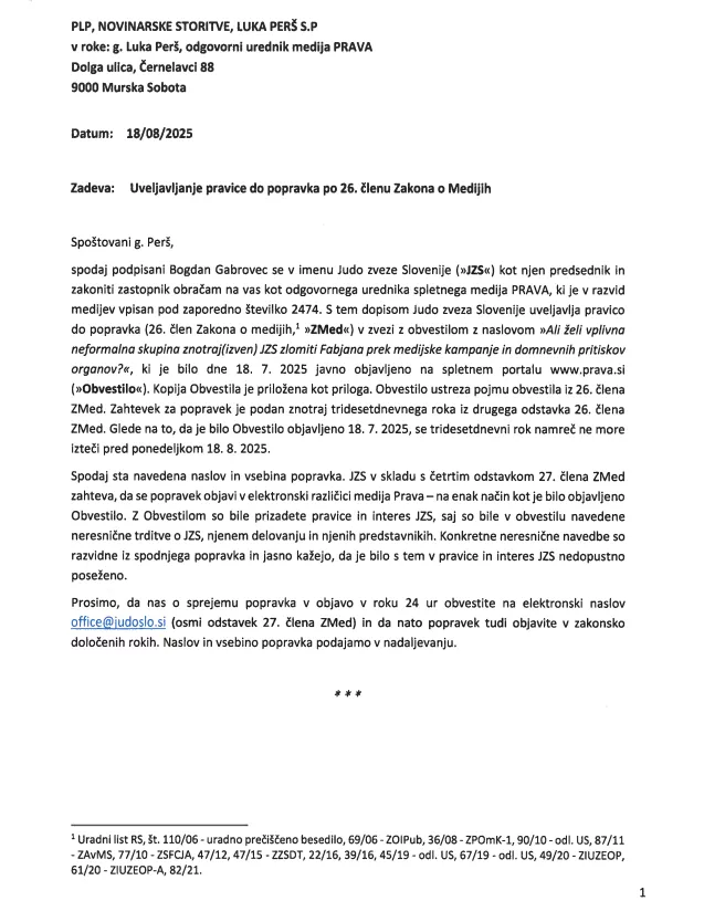 V spletnem mediju Prava.si smo v petek, 19. julija 2025, ob 12.33 objavili članek z naslovom Ali želi vplivna neformalna skupina znotraj (oz. zunaj) JZS zlomiti Fabjana prek medijske kampanje in domnevnih pritiskov organov?. Ker je v našem sistemu število znakov v naslovu omejeno na 125, celotnega naslova članka nismo mogli zapisati. Zato smo uporabili skrajšano različico. Na podlagi 26. člena Zakona o medijih objavljamo popravek predsednika Judo zveze Slovenije, g. Bogdana Gabrovca.