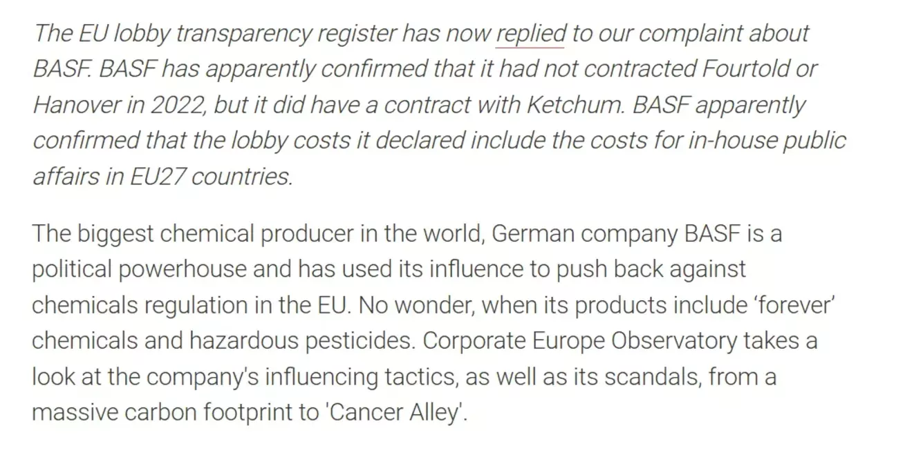 Odlomek iz novinarskega članka z naslovom Chemical romance: how politicians fell for BASF objavljen v https://corporateeurope.org/ 15. marca 2023. (Foto: Posnetek zaslona-Coorporate Europe)