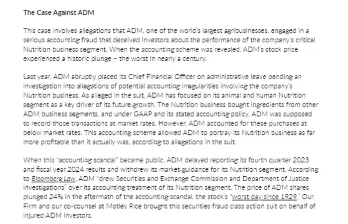 Odlomek iz članka z naslovom Bloomberg Law: “ADM Must Defend Against Investor Claims of Accounting Issues” objavljen na https://www.rgrdlaw.com/ dne 26. marca 2025.