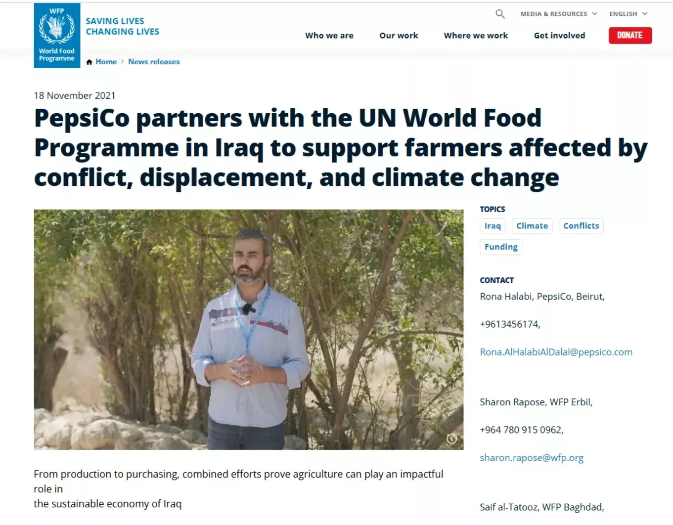 Še en primer globalistične humanitarnosti, ki jo za potrebe lastnih ekonomskih interesov deluje PepsiCO. Tako lahko na United Natios Global preberete, da sodeluje že več kot 20 tisoč podjetij po svetu. (Foto: Posnetek zaslona- World food program WFP)