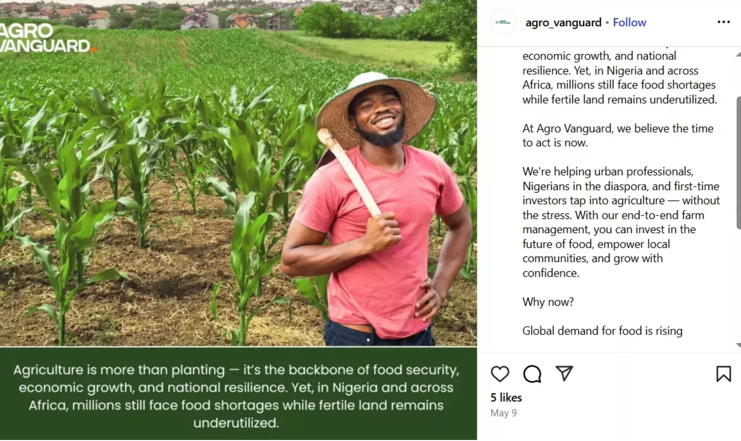 Tudi Vanguard svoj prijazni globalistični obraz prikazuje v "skrbi" za nigerijsko kmetijstvo. (Foto: Posnetek zaslona-Instagram)