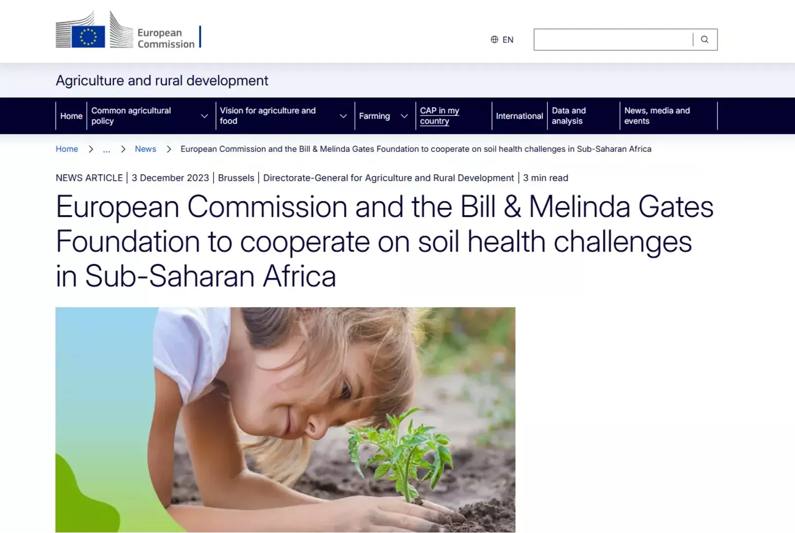 Sodelovanje med Evropsko komisijo in fundacijo Bill in Melinda Gates v članku z naslovom European Commission and the Bill & Melinda Gates Foundation to cooperate on soil health challenges in Sub-Saharan Africa objavljen tretjega decembra 2023. (Foto: Posnetek zaslona-Agriculture.ec.eu)