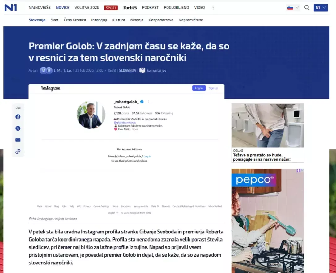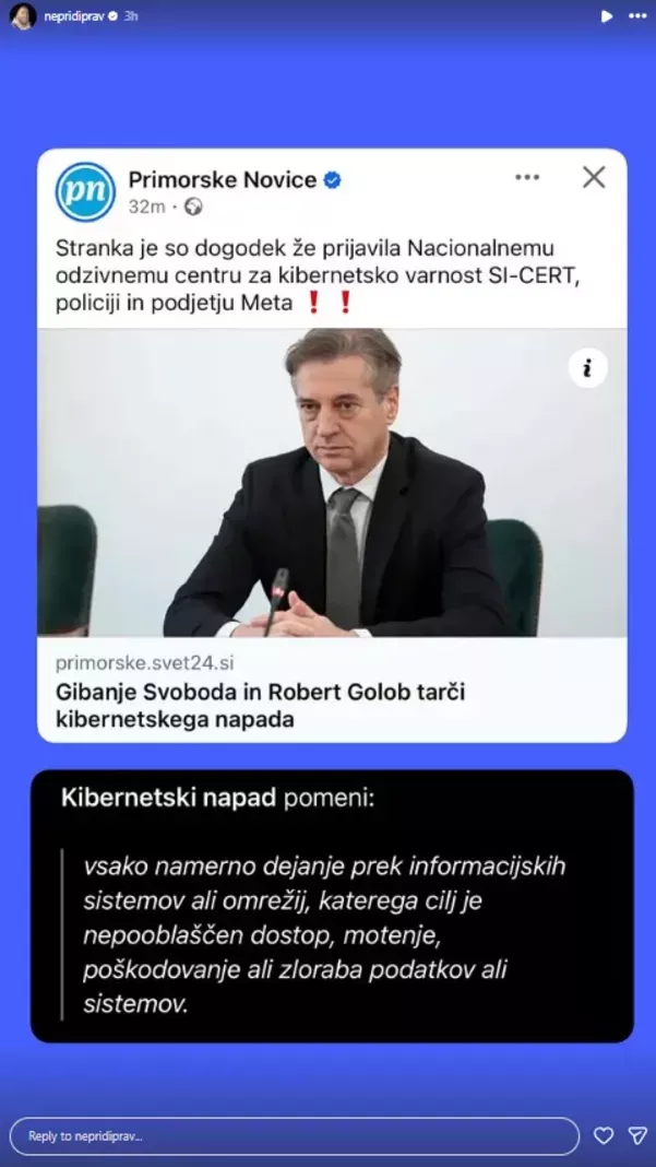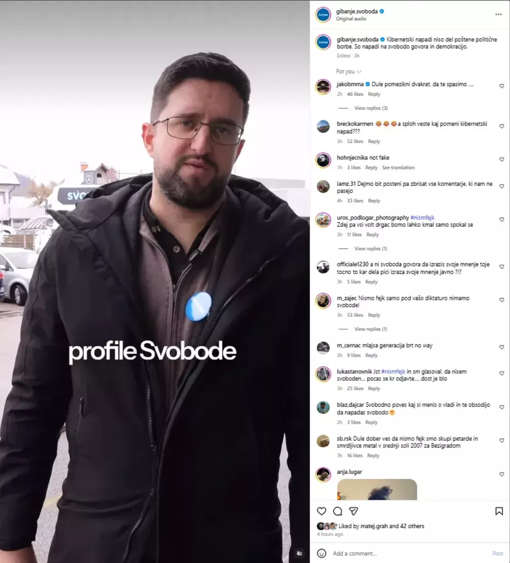 Ali se predsednik vlade dr. Robert Golob in njegova stranka Gibanje Svoboda zapletata v afero, ker se jima je – zgodilo ljudstvo? V zadnjih 24 urah beremo o domnevnem kibernetskem napadu na Instagram profil predsednika vlade dr. Roberta Goloba in njegove stranke Gibanje Svoboda. Po besedah poslanca iste stranke Lenarta Žavbija se je nenadoma pojavilo več kot pet tisoč uporabnikov, ki so množično komentirali njihove objave. Predvsem objave dr. Roberta Goloba. V paniki so sedaj za javnost njegov profil zaprli.