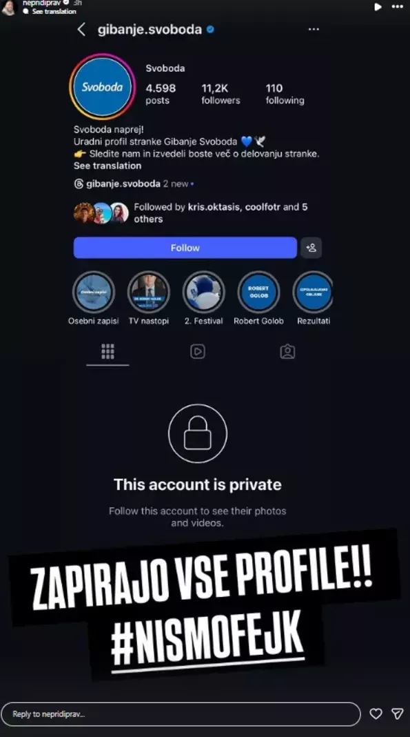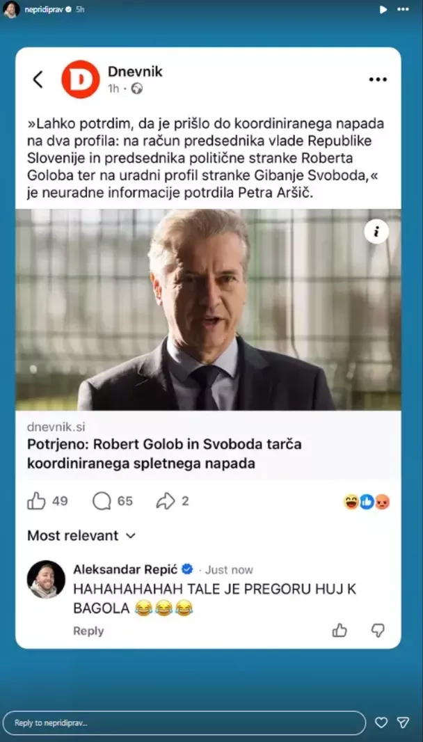 Predsednik vlade dr. Robert Golob dramatično govori o "hekerskem napadu" iz tujine. V resnici pa so sledilci Instagram vplivneža Aleksandra Repića le izrazili svoje demokratično mnenje. Zdaj pa so tako zaprli profil Goloba kot stranke GS. (Foto: Posnetek zaslona-IG Aleksandar Repić)
