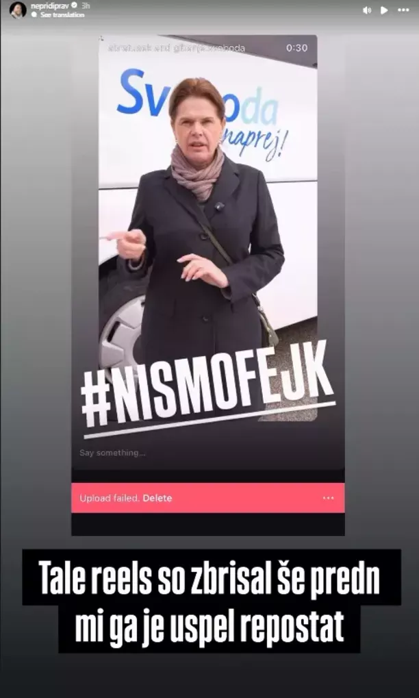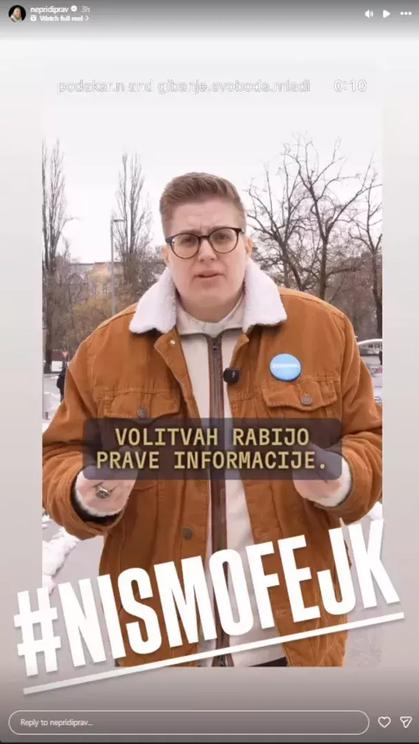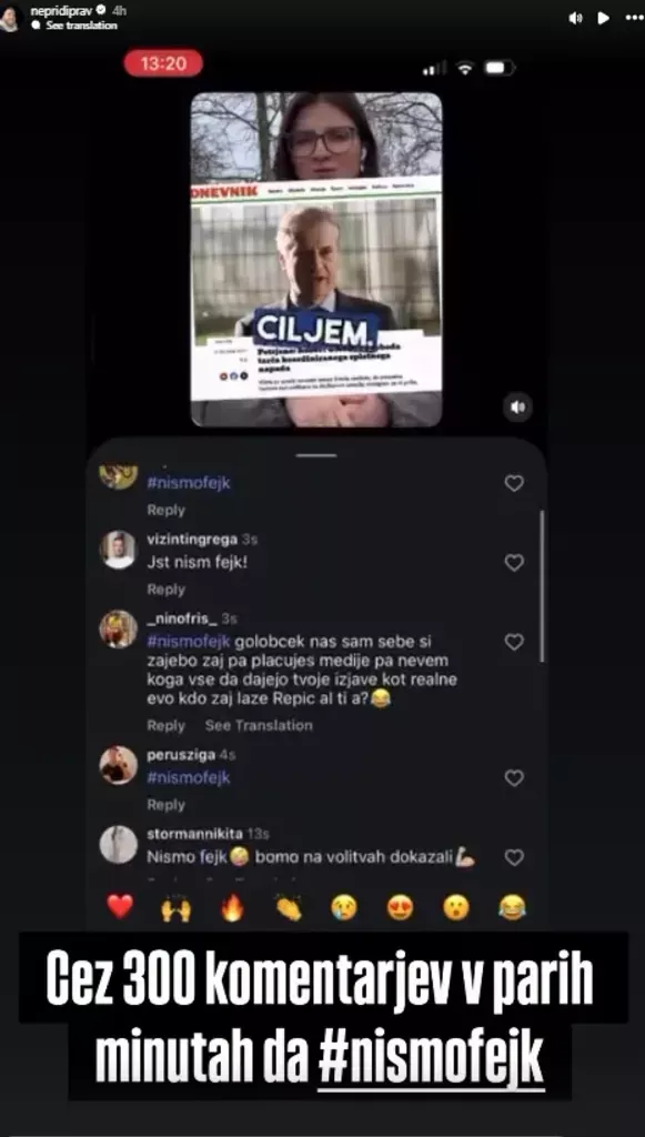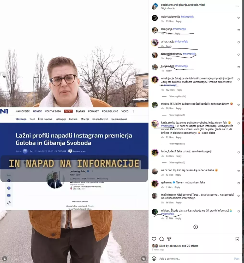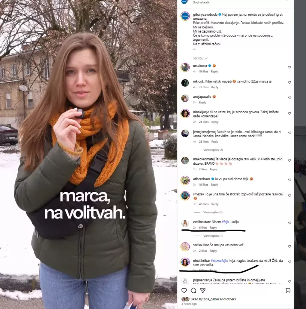 Veliko sledilcev Repića pod drugimi objavami Gibanje Svoboda in njihovih članov sedaj označuje sebe #NISMOFEJK!. (Foto: Posnetek zaslona-IG Gibanje mladi)