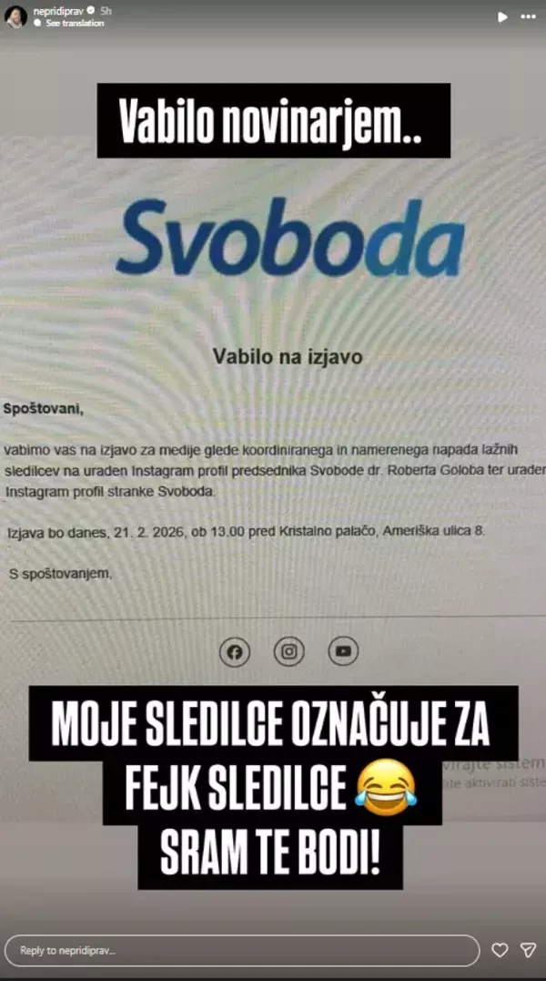 Neverjetno, a resnično. Predsednik vlade dr. Robert Golob in najbolj vidni člani Gibanja Svoboda so zagnali vik in krik, da naj bi se nad Golobovim Instagram profilom zgodil načrtovan hekerski napad iz tujine s slovenskimi naročniki. Poslanec Žavbi je povedal, da se je pod Golobovimi objavami pojavilo pet tisoč komentarjev. Vendar je resnica, kot kaže, veliko preprostejša od tiste, ki jo predstavljajo Golob in najvidnejši predstavniki njegove stranke. To se lahko zgodi samo pri nas. Instagram vplivnež Aleksandar Repić je svojih več kot sto tisoč sledilcev pozval, naj pod objavami predsednika vlade dr. Roberta Goloba napišejo komentar. Kot kaže, se je res zgodil množični odziv, med katerim je bilo veliko kritičnih komentarjev o delu aktualne vlade. Toda to naj bi sedanje oblastnike tako prestrašilo, da so zaprli tako Golobov Instagram profil kot tudi profil Gibanja Svoboda in predstavili da gre za ORGANIZIRAN HEKERSKI NAPAD IZ TUJINE. Jezni Repićevi sledilci, ki jih je več kot 100 tisoč, Golobu in Gibanju Svoboda sporočajo: #NISMOFEJK. Repić pa zahteva tudi javno soočenje z Golobom. Še bo pestro.